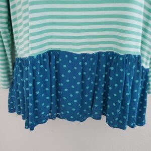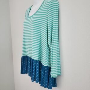 Matilda Jane Talk Tomorrow women's top - mixed media top, stretchy modal jersey top, crinkle gauze peplum/ruffle bottom, long sleeves, scoop neckline, striped top, polka dot bottom and front overlapped slip. Green.