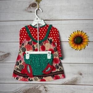 Darling two-piece Matilda Jane outfit for baby girls. A charming dress and bloomer set with a delightful design. The dress showcases a vibrant red bodice adorned with white polka dots, complemented by a green ruffled collar and a floral print on the lower portion. The bloomers feature matching green polka dots and charming ruffles, completing the set. The dress has long sleeves, making it suitable for cooler weather.
