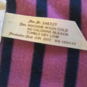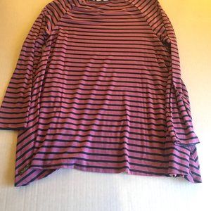"Matilda Jane" violet and navy striped top with white striped trim and pocket details; slightly longer hemline at the outer edges of the shirt. Gently Used