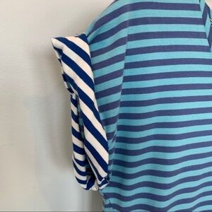 So soft, fun design, blue with stripes, longer on the sides, tiny white spots on back (pictured), must be part of the fabric as this is new with tags, hardly noticeable