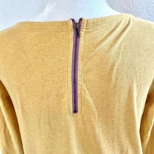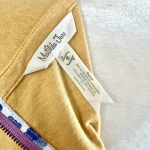 Add some bohemian flair to your wardrobe with this Matilda Jane Weekend Vibes blouse in size small. The yellow mixed floral print and tiered ruffle hem add a playful touch to this tunic-style top. The classic/fitted sleeves and crew neck neckline make it a perfect choice for any casual occasion, whether you're traveling or just running errands. The zip closure at the back adds a touch of detail to this blouse, while the spandex, rayon, and cotton material make it comfortable and machine washable. This blouse is perfect for all seasons, from winter to summer, and features collarless detailing.