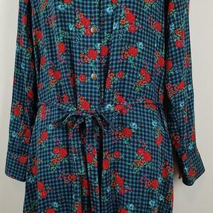 NWT Matilda Jane Women's Fa La La Dress in blue and green gingham with red, blue, green, orange, pink, and white florals. This dress features a collar, button front, waist tie, 2 hidden seam pockets, gold contrasting button placket and collar, optional roll tab sleeves, and bottom side vents. 100% rayon. Size Medium.
