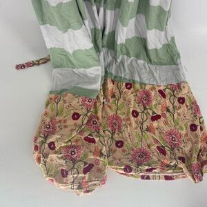 • Stripes with floral pattern on neckline, hem, and waist tie
