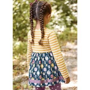 Adorable Matilda Jane “Time for Fun” Tunic from the Fall 2020 Wonderment collection. Features yellow and white striped long sleeves with colorful buttons and aqua ruffle detail on the chest. The skirt portion has a whimsical vintage-style clock and birdhouse print with a purple grosgrain ribbon trim. Made from a soft, stretchy blend (95% cotton, 5% spandex) that’s perfect for play or layering.