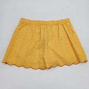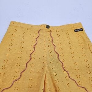 Bright yellow shorts with eyelet design. Scalloped hem and button closure. Perfect for sunny days.
