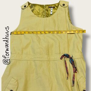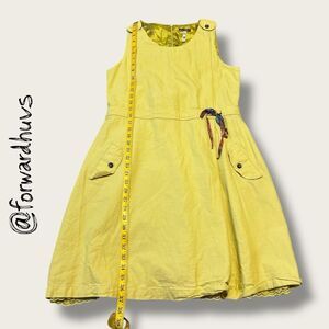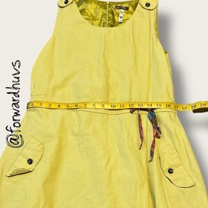 This cheerful sleeveless dress from Matilda Jane Clothing Co. features a sunny yellow cotton body with playful details and a flattering silhouette. Part of the “You & Me” collection, it includes button accents at the shoulders, a multicolor side tie at the waist, and a functional flap pocket with button closure near the hip. The dress is tagged Size Medium, made in March 2011, and constructed from 100% cotton (exclusive of trims) for breathable comfort and casual charm.