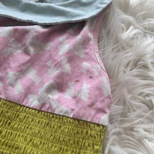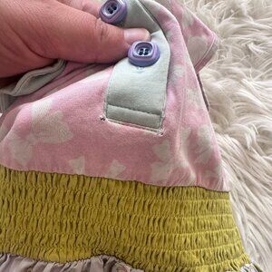Play condition for stains (pointed out in the photos and the ones on the back shoulder are shown) and small holes near the button panel of fabric, also shown in the photos.