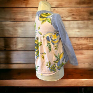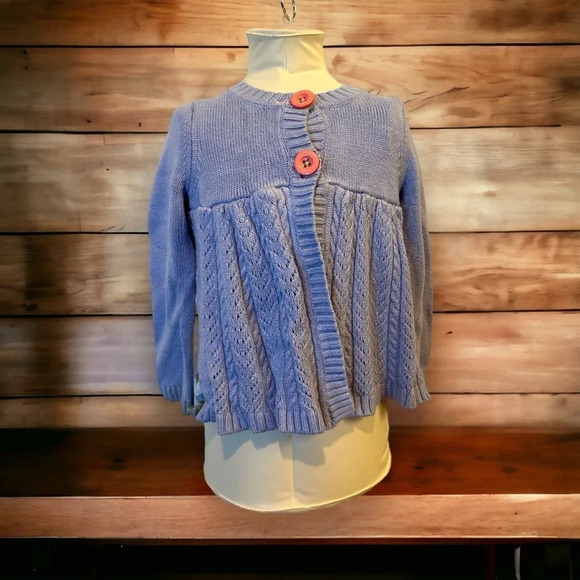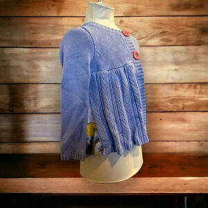 Matilda Jane LITTLE ONE CARDIGAN Girls Knit Sweater SIZE 12-18. THE ADVENTURE BEGINS. Sweater is a periwinkle blue with pink buttons, back has a white background with blue, green and yellow floral pattern. In excellent previously owned condition. Made with 70% viscose 30% Nylon. From a smoke free home.