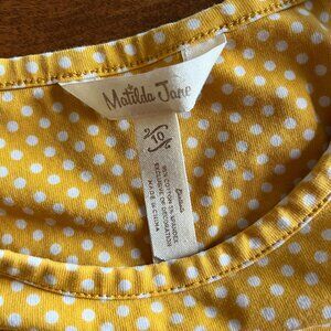Matilda Jane golden yellow flutter-sleeve summer dress with polka dot fabric at the top and floral wildflower fabric for the skirt. Girls' size 10. Cute details like sage green ric-rac across the chest. Style is the "Stand Tall, Be Sweet Dress" from the 2019 Brilliant Daydream collection. VGUC; slight wash wear.