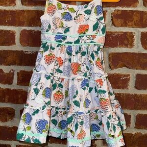 Matilda Jane lilac floral with yellow daisy like trim. Tiered dress with aqua blue Rick rack trim at the bottom. Aqua trim on the waistband as well. Large pretty purple buttons on the yellow front detail. Size 2 little girls toddler.
