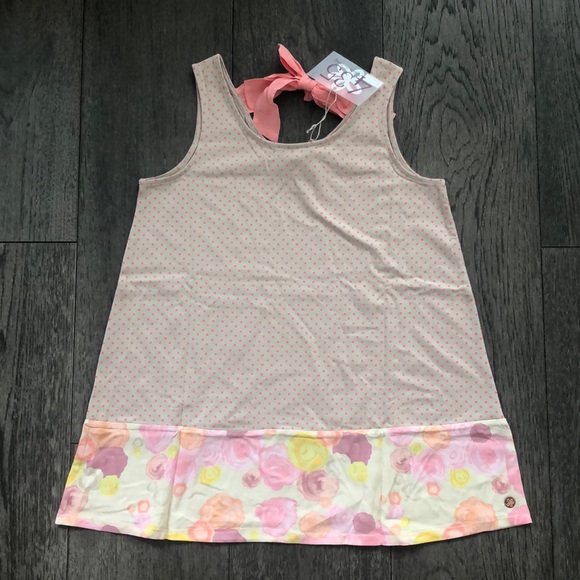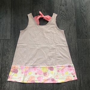 Matilda Jane girl’s pink polka dots top tank. She'll look oh-so cool both coming and going in this A-line tank decked in a mix of polka dot and floral prints and finished with a flowy bow in the back.Self: 95% cotton / 5% spandex. Contrast: 100% rayon. Excellent conditions. Brand new with tag