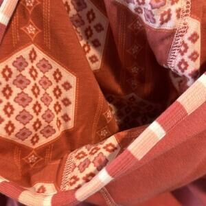 New with tags (NWT) Matilda Jane Blair hoodie size 4 toddler. Full zip down hoodie in rosy pink/rust with ruffle bottom and stitching on sleeves add definition. Gold zipper detail with blue ribbon. Interior of hood with pink, coral and white patchwork patterns and coordinating colors on piping details along edge of hood and as stripes on the cuffs. Contrast stitching in pink on body of hoodie and along hemline really elevate from a typical hoodie. Fabric has stretch.