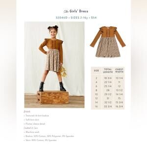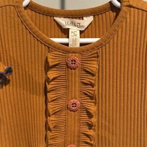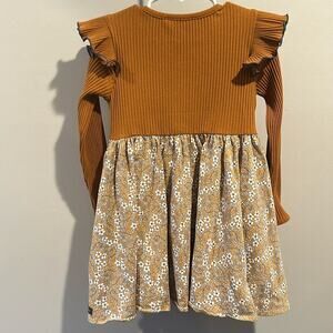 New without tags (NWOT) Matilda Jane Clio long sleeve dress size 4 toddler. Dress features a textured ribbed knit bodice with stretch for a comfortable fit. Colorway is a stunning solid goldenrod on top and skirt is a floral print in goldenrod/mustard yellow, navy blue and white. Skirt has pockets and lots of flounce, is not lined but has solid fabric on underside. Flutter sleeve has ruffle detail and trimmed in navy blue. Beautiful buttons down front add detail and more ruffled panel on front of dress as well. Colorway offers fall tones making it a great holiday or Thanksgiving option but would also be beautiful for fall photo shoot or for a back to school look.