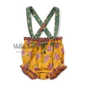 Adorable Matilda Jane x Joanna Gaines “Plant A Seed” bubble romper overalls in size 3-6 months. Features a golden mustard floral print with rose pink polka dot trim and green floral crisscross straps. Ruffle detail at the leg openings and stretchy waistband for comfort and fit.