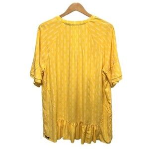 Matilda Jane yellow top with white geometric shapes v neck button down front with longer peplum ruffles in back with ruffle short sleeves.