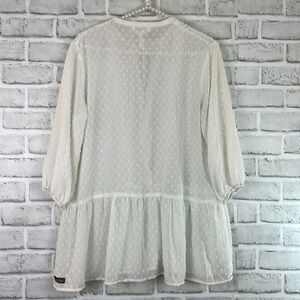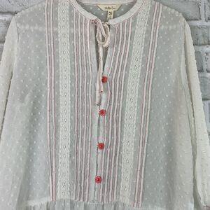 The Adventure Begins - Light the Way Top. Light weight and flowy! Sheer top with dot details and lace trim. Coral buttons with tie