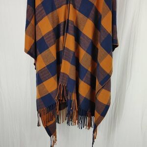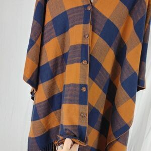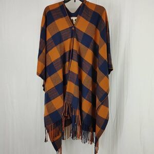 Matilda Jane Warm Sunset Button Front Poncho One Size Navy Blue Rust Orange Plaid.