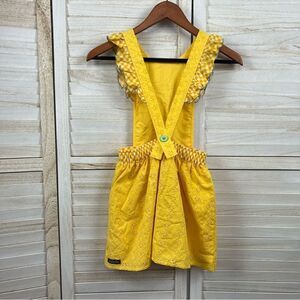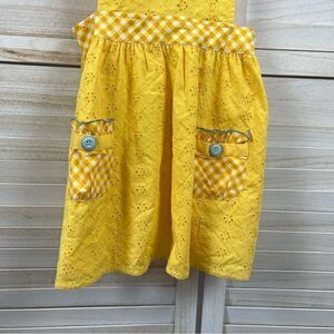 Sunny yellow eyelete pinafore with subtle cornflower blue accent seams and button and yellow and white gingham contrast details