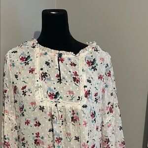 This Matilda Jane blouse showcases a relaxed fit with charming ruffled details and a mandarin collar. The cream and pink color palette complements the 3/4 bell sleeves, making it a stylish choice for any occasion.