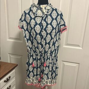 Elegant romper with indigo and cream floral patterns. Perfect for a stylish look.