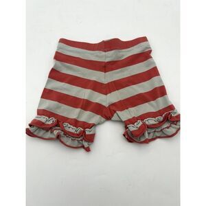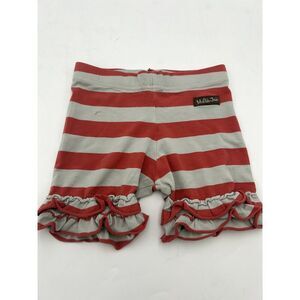 These adorable baby girl shorts feature a charming horizontal stripe pattern in red and gray. The leg openings are finished with multiple layers of ruffles, adding a whimsical touch. Soft and comfortable for everyday wear, these bottoms are perfect for little ones. Their playful design makes them a stylish addition to any outfit.