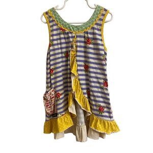 Purple and white striped tunic with floral print throughout. Pockets with fish print. Yellow polka dot ruffles. Open back. Sleeveless.