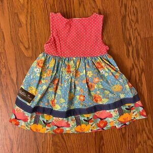 Sleeveless floral dress. Jersey bodice is pink with white polka dots, a blue ruffle and blue logo buttons. Skirt is blue with multicolored floral designs. Grosgrain ribbon detail. Style# 25043D