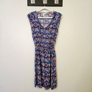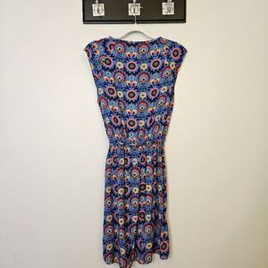 Blue floral dress with elastic waist and tie front. Comes with drawstring belt, but this has been cut so it's shorter than it should be. Otherwise in excellent pre loved condition. 100% rayon.