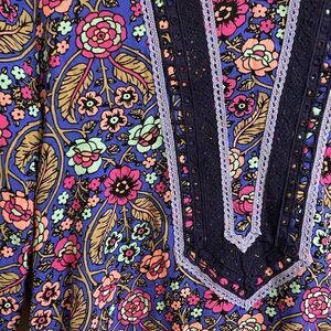 Blueish purple long sleeve tunic dress. Floral pattern is magenta, pink, blue and tan. Lace accents on bodice. High low hem. 100% Rayon. No stretch.