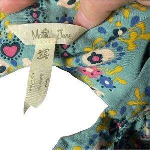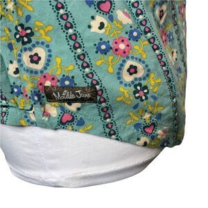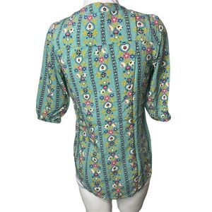 Green body with floral paisley heart pattern with accents of pink, yellow, cream, blue. button up. Slight hi lo hem.
