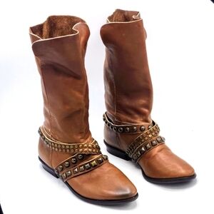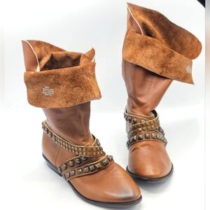 Matisse Brown Cognac Soft Leather Slip-On Fold Over Studded Strap Mid-Calf Boot Size 7.5 M