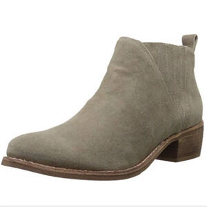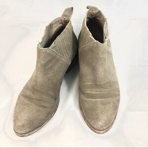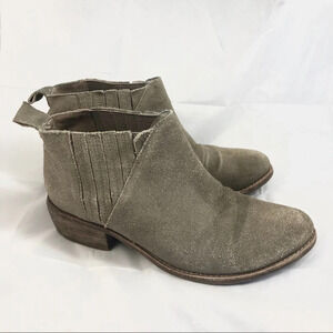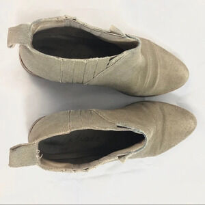 Tan suede slip on Booties with elastic and small heel. Ultra