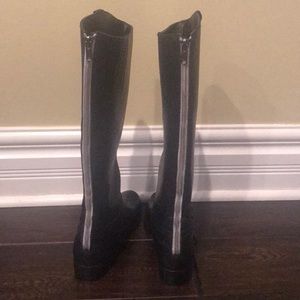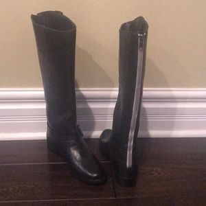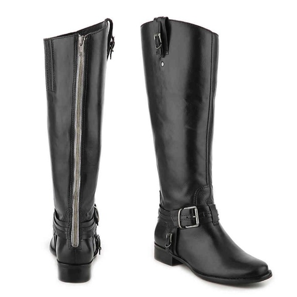 Tall riding boot featuring buckle detailing and back zip closure for easy wear. Round toe. Leather upper. Fabric lining. Cushioned footbed. Approx 15” shaft height with approx 14” calf circumference. Heel approx 1”. Made in Brazil. Size 6.5. New without the box.