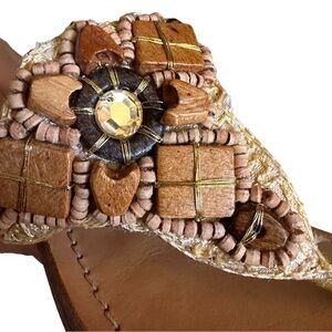 Step into summer style with these handcrafted Matisse boho thong sandals in size 6. Featuring genuine leather uppers and soles, these sandals are detailed with intricate wood, crystal, and gold bead embellishments in a floral motif. Lightweight and artisan-inspired, they offer both comfort and standout design.