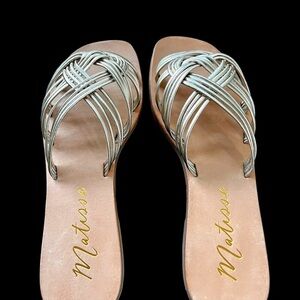 Gorgeous Matisse Gold Leather-upper Tate Slide Flat Sandals with tan cushioned foot beds, Size 9. Brand new without box. See photo for description.