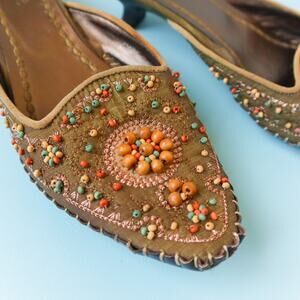 Features: Green base beaded moroccan style slip on kitten mule heels