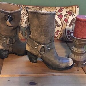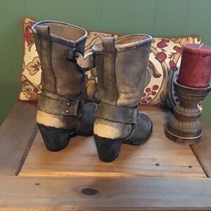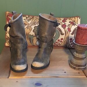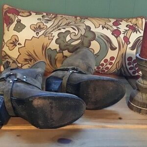 A throwback in time but oh so FINE! These little mid calf boots are every girl’s dream! Size 7 1/2 B, these distressed boots sport the infamous spur-like harness with silver studs that run under the boot. There are buckles on the outside, and the outside shaft is slightly lower than the inside. The 3” slanted heel makes these fun and funky! They are in excellent pre-loved condition and are waiting to hit a dance floor soon! They are intentionally distressed which adds to their character.