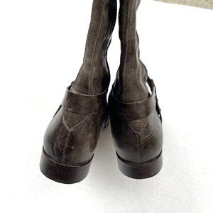 Pre-lovedMatisse Wilmer classic riding boot in the color charcoal (gray brown color) featuring a leather upper, functional dual side zippers, pointed toe, fabric lining, synthetic sole and distressed look. Made in Brazil. 1 in heel height