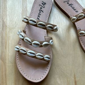 Beautiful Matisse sandals are adorned with shells going across each strap. Three straps. Tan color with off white shells. Rubber boot. Flat sole. Size 9. New in box.