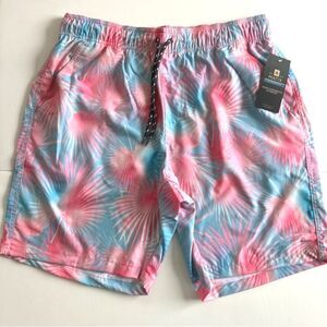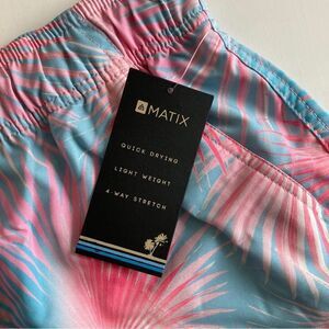Matix Hybrid Performance Swim Trunks 9". Quick drying, 4 way stretch. Tropical palm leaf print. Two side pockets, one back pocket. Perfect for spring, summer, travel, vacation, beach, and other outdoor activities. Gender neutral, unisex.