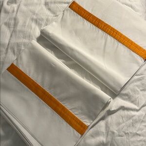 New but I don’t have the original packaging. Pair of king pillowcases color is tangerine style is Lowell Matouk