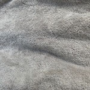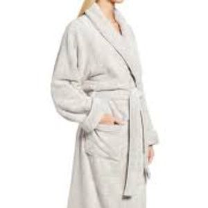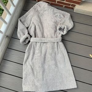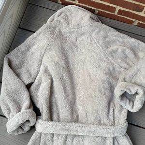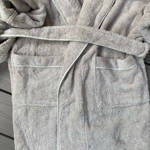 Classic terry robe made in Portugal and certified organic from Matouk!! Features a plush shawl-collar, soft absorbent cotton terry knit fabric, tie belt closure, 2 pockets in front, drop long sleeves, made of 100% cotton and measures approx 43" top of shoulder to bottom of hem, 22.5" under arm to under arm, 24" sleeve length. Excellent condition, with wrinkles and very minor pulls in terry cloth throughout from store handling, as pictured. In Pool, which is a light silvery gray. Size medium/ large.