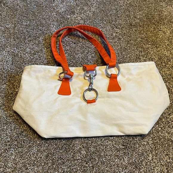 Matrix bag color is white and orange a clip in the front to unclip and clip back on. It’s got two handles and 2 strings inside to tie. In good condition.