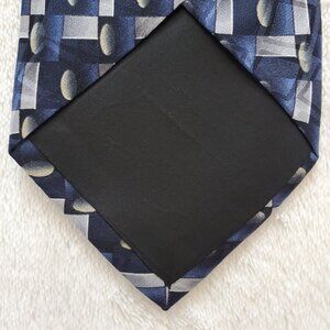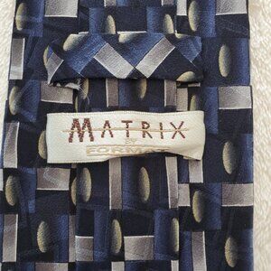 Matrix by Format silk tie featuring a geometric pattern in shades of blue, gray, and black.