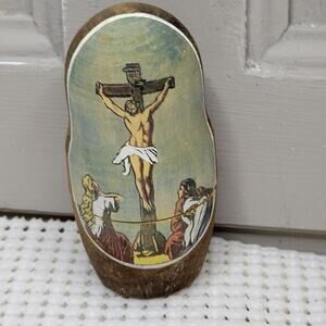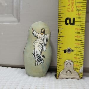 Five piece set of a wooden Matryoshka Nesting Doll depicting life cycle scenes of the life of Jesus Christ.