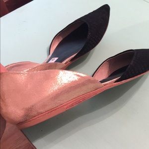 Size 8... True to size. Amazing flats!!! Flat black in front with great texture and a soft shimmering champagne in the back.