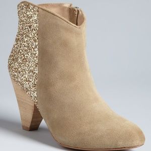 Stylish tan suede ankle boots with glittering gold accents. Perfect for a chic look.