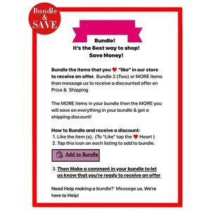 Bundle your other favorite items in our closet to save on shipping and to be eligible for a price discount. (Add items to your Bundle by tapping the “+” shopping bag at the bottom of the listing) A Bundle of 2 or more items typically are eligible for a price and shipping discount . If you need help or have questions on how to bundle, please ask. We are here to help.