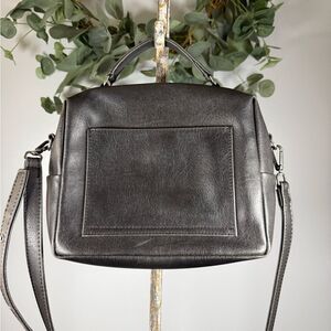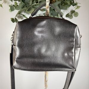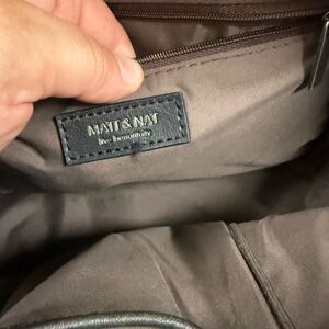 The Matt & Nat ARC Vegan Crossbody Bag in Black is a stylish and sustainable accessory for women. Made from vegan leather with a solid black exterior and gray hardware, this medium-sized bag features a zip closure and a matte finish. The faux leather handle/strap in black adds a touch of color to the overall design, making it a versatile option for everyday use. The brown lining and the crossbody style complete the chic look of this MATT & NAT handbag.