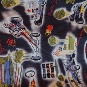 Very cool gearhead shirt by Matt Rider. Button Front with images of drag racing cars throughout.